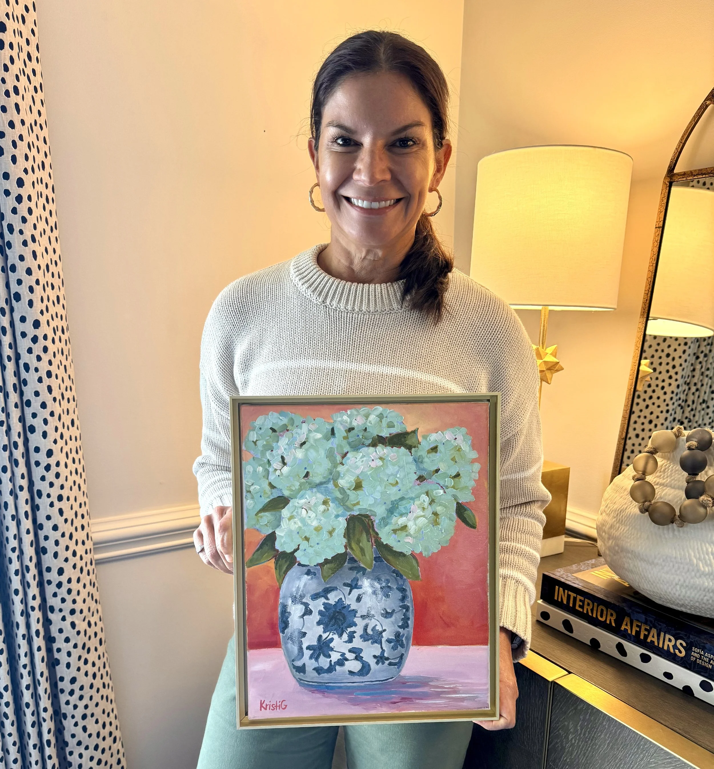 I am drawn to painting flowers because they simply make people happy! I love painting the stems, petals, leaves…all of it! Their vibrant colors, natural beauty, and fleeting nature inspire me to create pieces that would last forever. That’s where my tagline came from—Flowers That Never Die. Dying blooms can be a little sad, so I love that my work captures flowers at their most joyful and vibrant. Inspired by nature’s colors and textures-and encouraged daily by the love of my family-each piece I create is a celebration of joy, resilience, and timeless beauty. Each of my paintings is named after the incredible women, friends, and family who encourage me to keep creating.